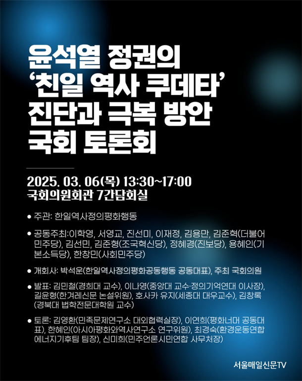 2025³âÀº ±¤º¹ 80ÁÖ³â, À»¹Ì»çº¯ 130³â, À»»ç´Á¾à 120³â, ÇÑÀÏÇù¾à 60³âÀÌ µÇ´Â ÇØ·Î, ÇÑÀÏ¿ª»çÁ¤ÀÇÆòÈ­ÇൿÀº 3.1ÀýÀ» ¸Â¾Æ À±¼®¿­ Á¤±ÇÀÇ ÇÑÀϰü°è Àü¹ÝÀ» Æò°¡ÇÏ°í ±¸Ã¼ÀûÀÎ ¹®Á¦Á¡À» ¤À¸¸ç, º¸´Ù ÆòÈ­·Ó°í ÆòµîÇÑ ÇÑÀϰü°è·Î ³ª¾Æ°¡±â À§ÇÑ Åä·Ðȸ¸¦ 3¿ù 6ÀÏ(¸ñ) ¿ÀÈÄ 1½Ã 30ºÐ ±¹È¸ÀÇ¿øÈ¸°ü 7°£´ãȸ½Ç¿¡¼­ °³ÃÖÇÒ ¿¹Á¤ÀÌ´Ù.